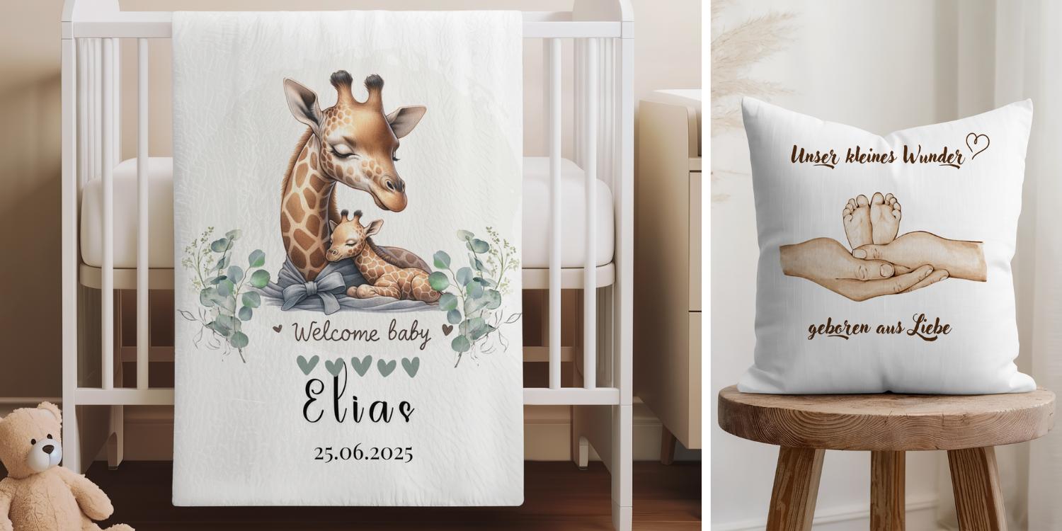 Bei Kuscheldeckentraum entstehen personalisierte Kissen und Decken genau für diese Anfänge: für das Willkommen, für die ersten Tage, für das Gefühl von Nähe und Geborgenheit.