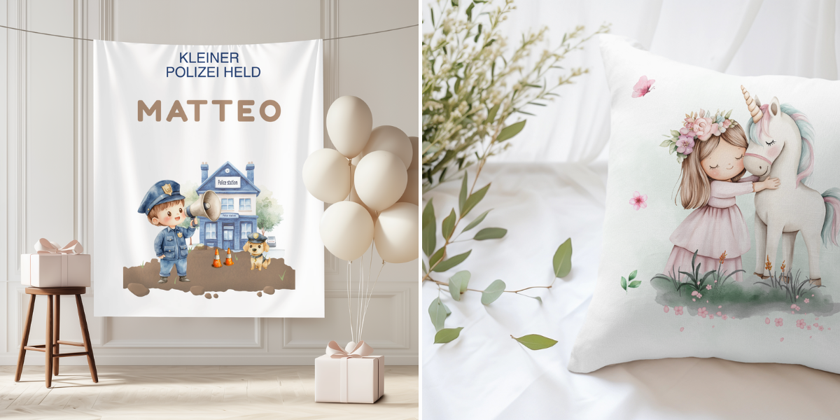 Liebevoll gestaltete Banner & Kinderkissen mit einzigartigen Motiven