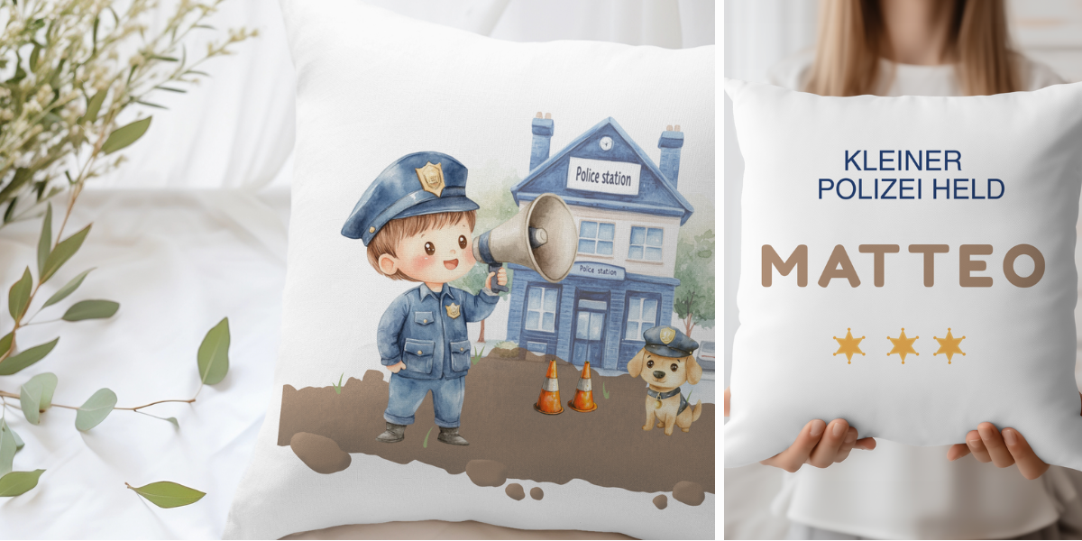 Ein echtes Unikat fĂźr kleine GesetzeshĂźter: Kissenbezug âKleiner Polizistâ mit Wunschname